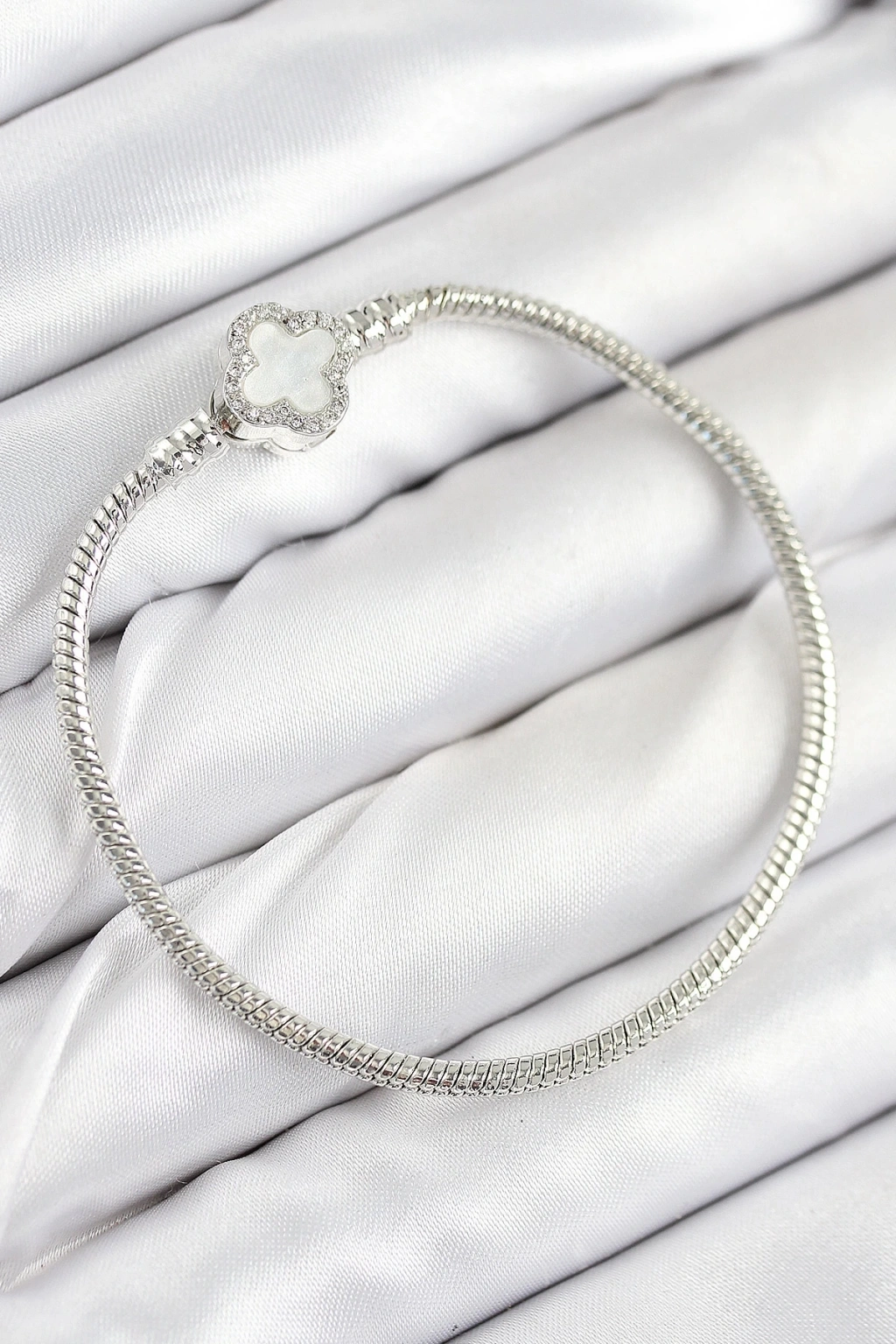 Pirinç Charm Zirkon Taşlı Yonca Model Gümüş Renk Kadın Bileklik
